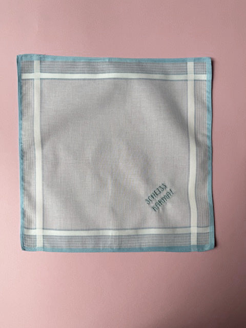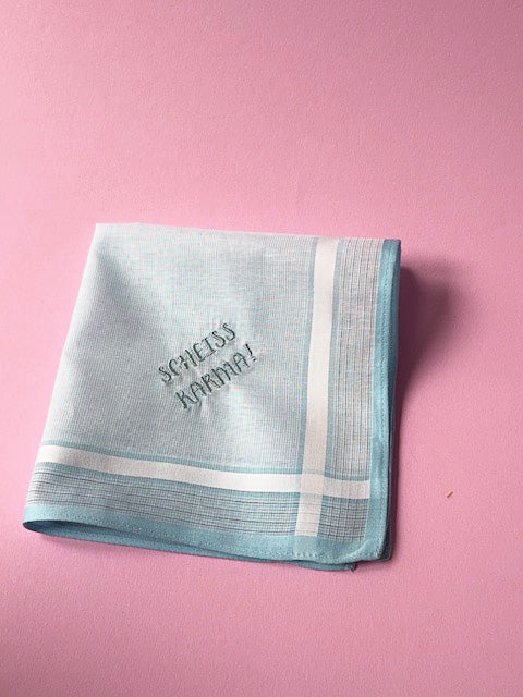 Besticktes Taschentuch „Scheiss Karma“ – Hellblaues Stofftaschentuch mit humorvollem Spruch